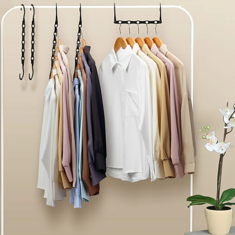 Pratici appendiabiti neri in plastica con 5 fori e due ganci per risparmiare spazio nell'armadio. Ideali per una migliore organizzazione e un facile accesso. Descrizione completa