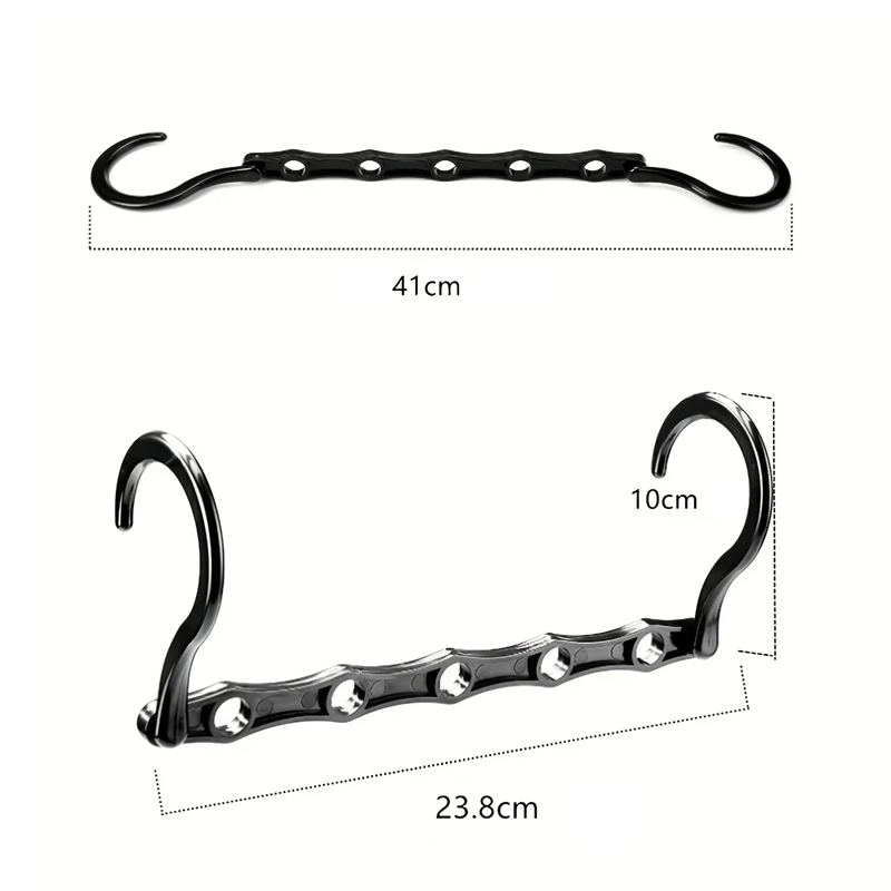 Questi appendiabiti salvaspazio sono una soluzione eccellente per ogni armadio, dove è necessario utilizzare efficacemente lo spazio e mantenere l'ordine. Gli appendiabiti sono realizzati in plastica resistente di colore nero elegante e sono dotati di cinque fori che consentono di appendere più capi d'abbigliamento su un solo appendiabiti. Grazie a due ganci di 10 cm di lunghezza, è possibile fissare facilmente gli appendiabiti su una barra standard per armadi. La lunghezza totale dell'appendiabiti è di 24 cm, il che garantisce spazio sufficiente per i vestiti senza occupare troppo spazio.
