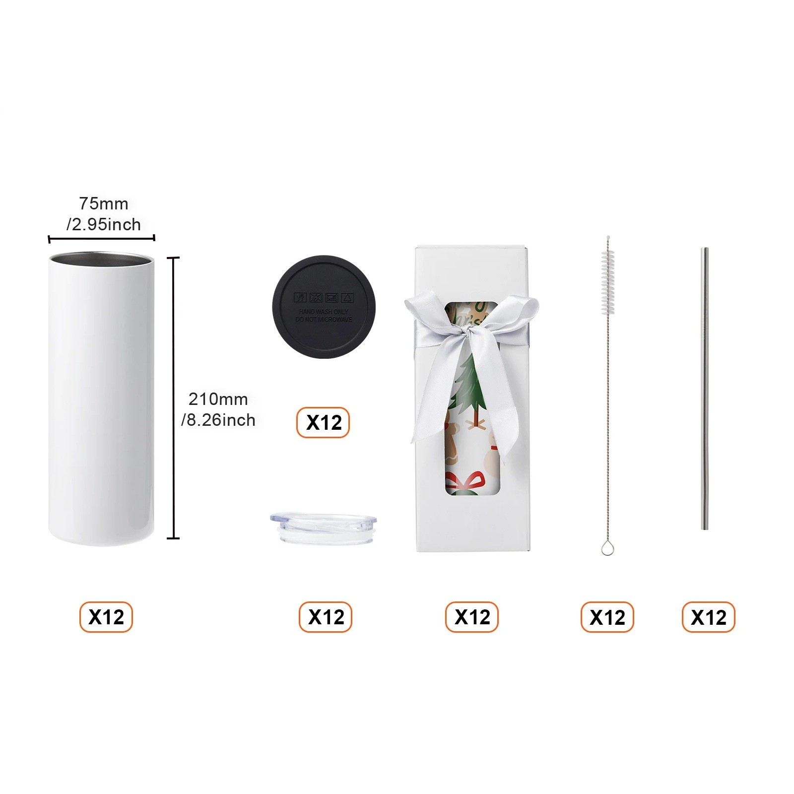 Le dimensioni di un tumbler sono circa 75 × 210 mm, il che corrisponde a un formato compatto e ben afferrabile. Il peso totale del set è di circa 3,95 kg, inclusi gli accessori. Nella confezione ci sono in totale 12 pezzi, quindi è una variante pratica per un set più grande di prodotti finiti. Ogni tumbler è dotato di accessori propri, aumentando l'utilizzabilità della confezione senza necessità di ulteriori accessori. Sono incluse anche scatole regalo bianche con fiocco, che consentono di preparare il prodotto finito per la consegna.