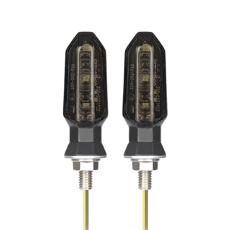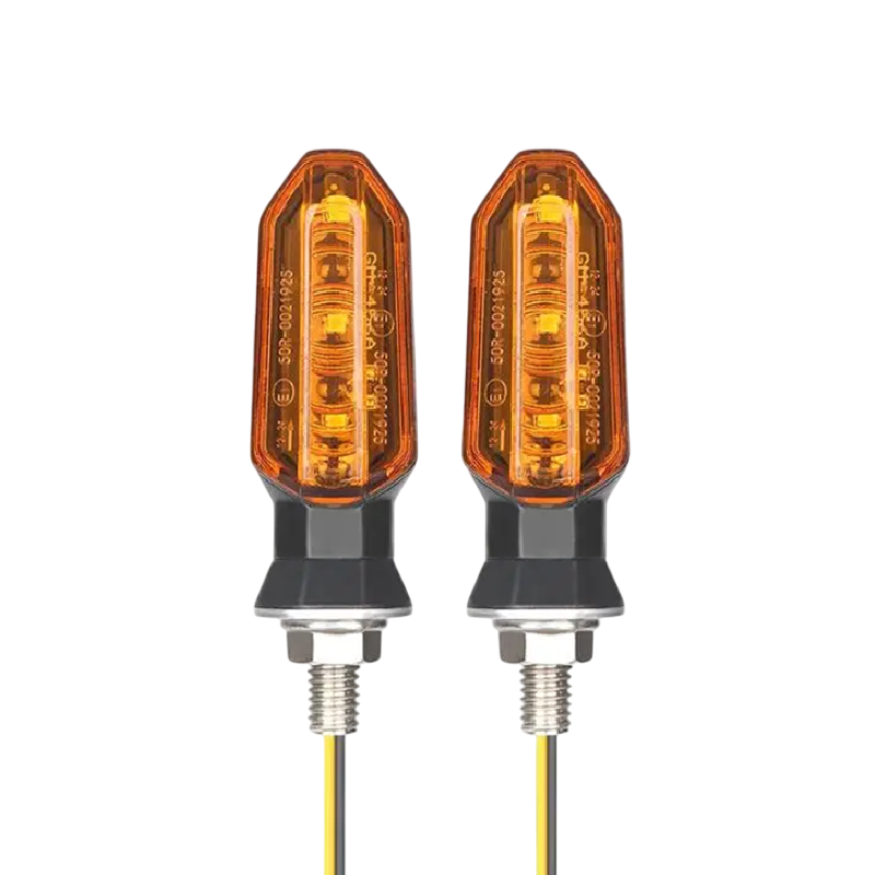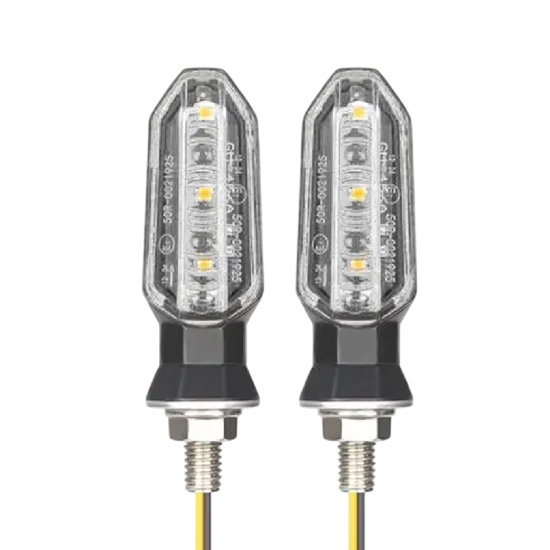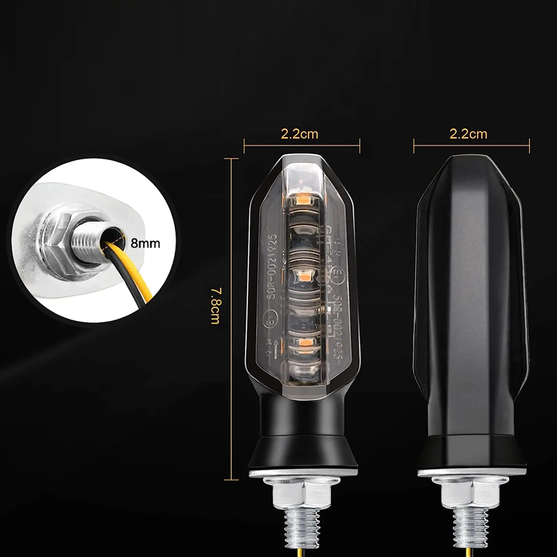 Indicatori LED compatti per moto con design impermeabile IP67, vite da 8mm e corpo resistente in ABS/PC per una guida sicura e stilosa. Descrizione completa