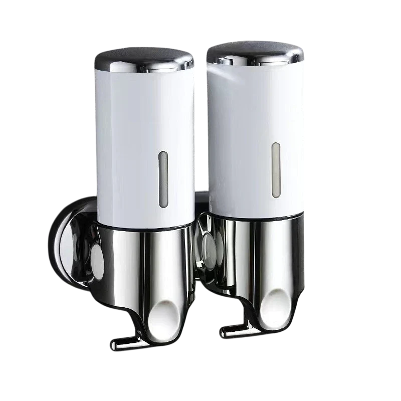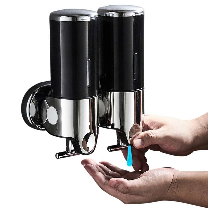 Pratica confezione di 2 dispenser da parete per sapone o shampoo, ideale per il bagno. Installazione semplice, costruzione resistente, kit di montaggio incluso. Descrizione completa