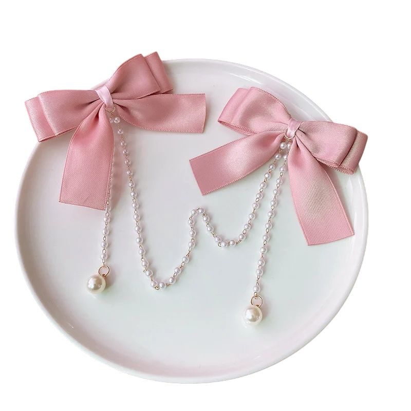 Fermagli per capelli eleganti con fiocchi in chiffon rosa e catena di perle. Accessorio elegante per ragazze e donne, adatto per eventi festivi. Descrizione completa