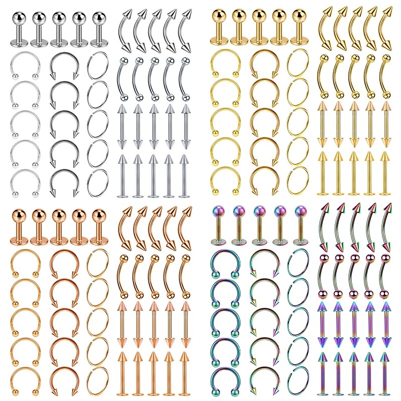Set universale di 40 pezzi di piercing in acciaio chirurgico di lunghezza 8 mm adatto per orecchie, naso, labbra e altre parti del corpo per un uso quotidiano. Descrizione completa