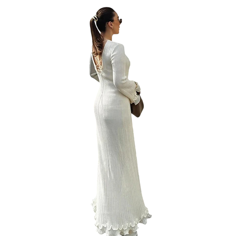 Abiti bianchi lavorati a maglia con maniche lunghe Abiti lunghi a coste con lacci sulla schiena Eleganti orli a volant Abiti maxi con scollatura
