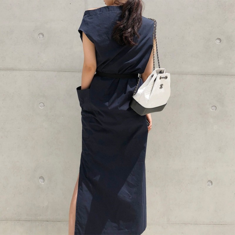 Stile elegante senza maniche con ampio scollo a barca.