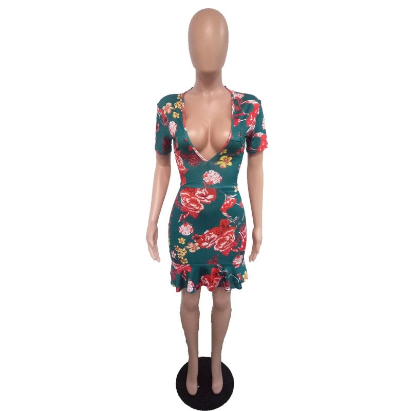 Abiti mini da donna con volant sulla gonna. Scollo profondo e maniche corte.