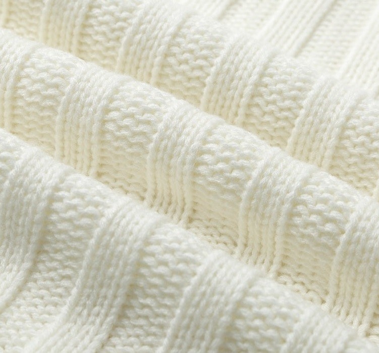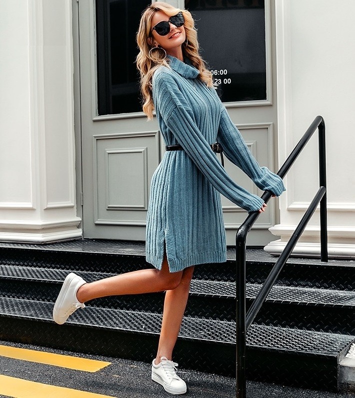 Teple pletené rolákové šaty s dlouhým rukávem.