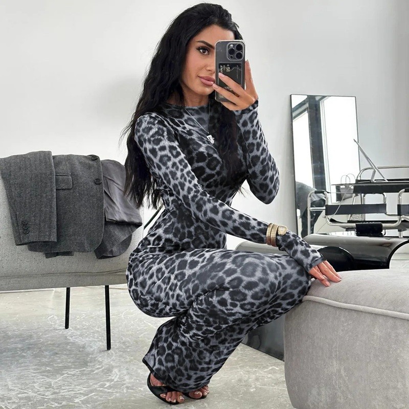 Abiti lunghi aderenti in rete con stampa leopardata Abiti trasparenti con maniche lunghe Motivi animali sensuali
