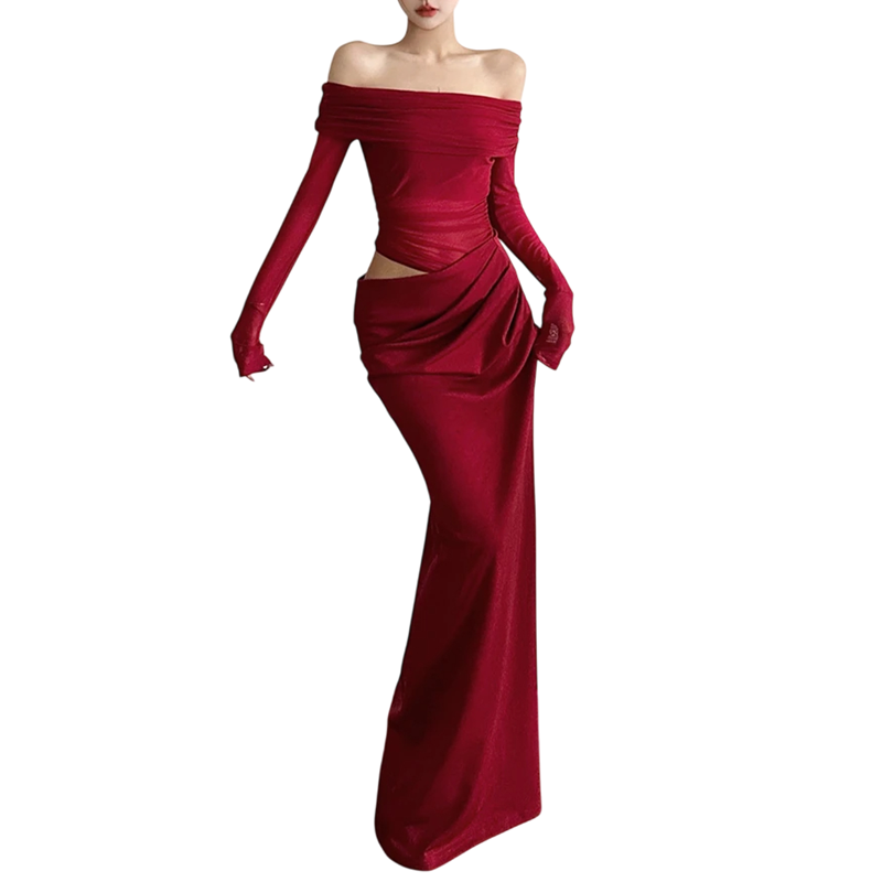 Abiti lunghi eleganti aderenti con spalle scoperte e maniche trasparenti Effetto arricciato stiloso in vita Outfit formale da sera
