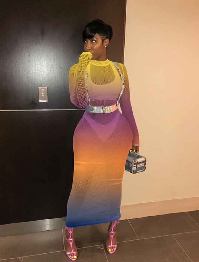 Originali abiti lunghi in rete dai colori arcobaleno.