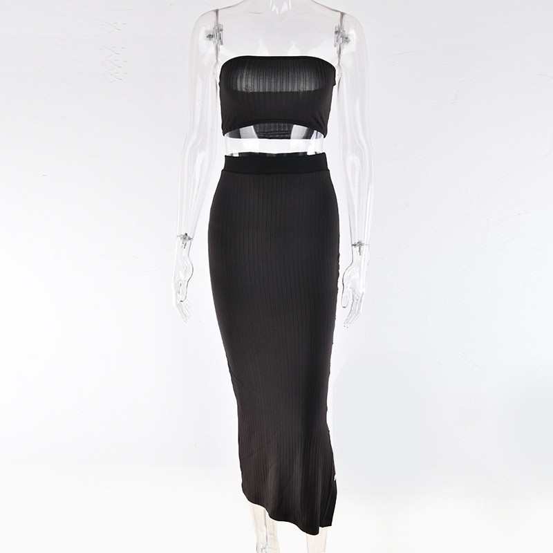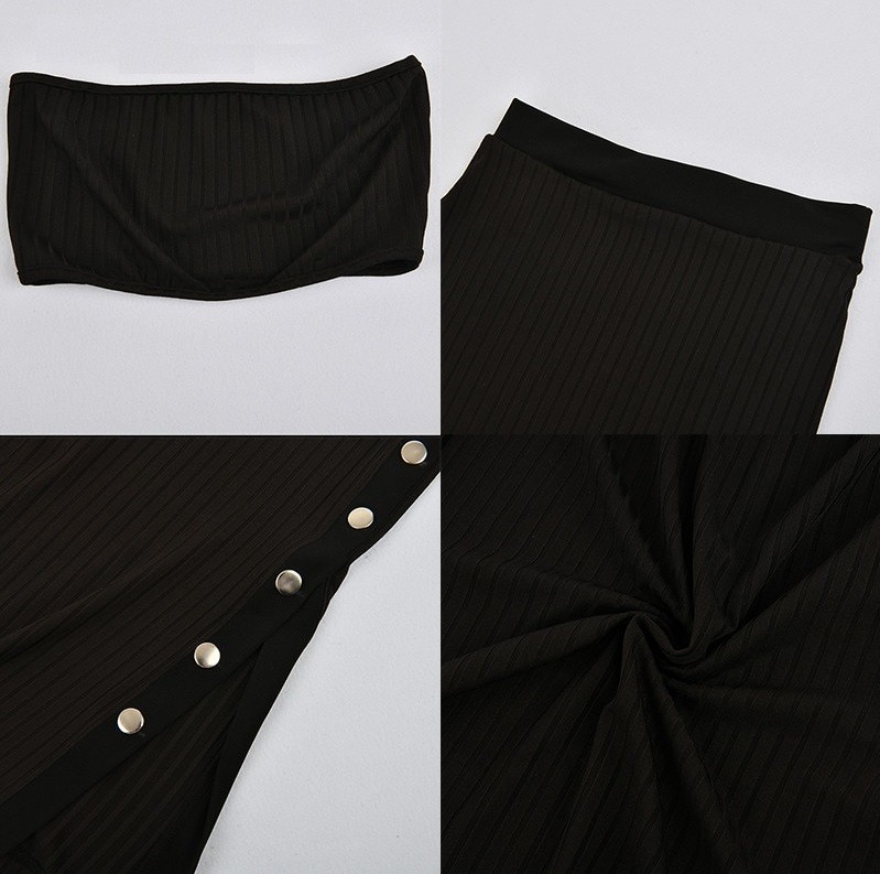 Composto da un top senza spalline e una gonna decorata con borchie.
