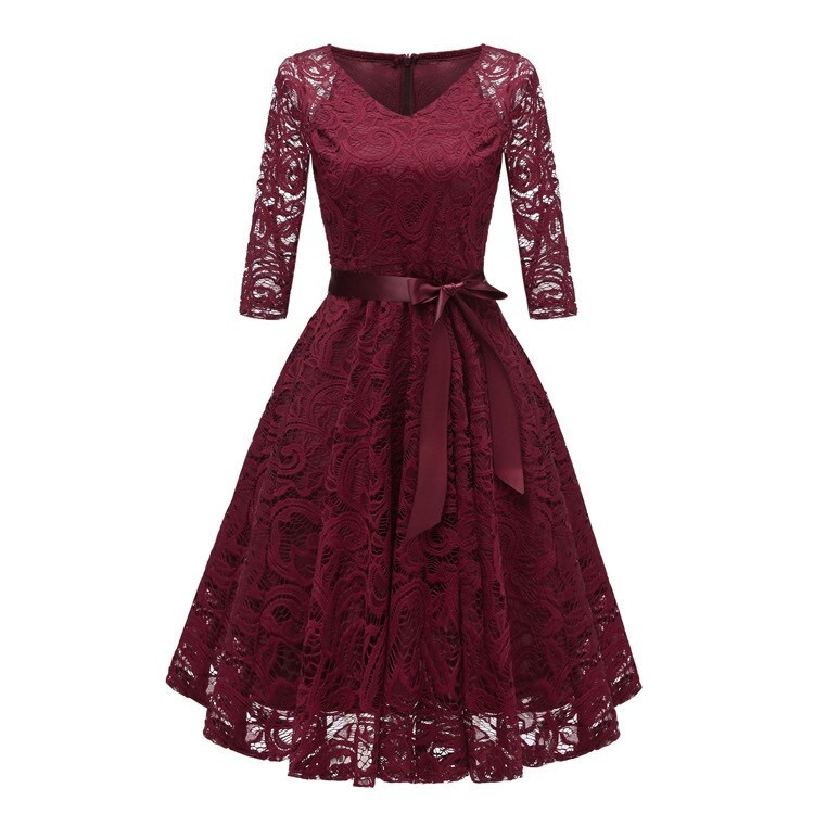 Elegante abito da donna. Ampia gonna e maniche in pizzo a tre quarti.