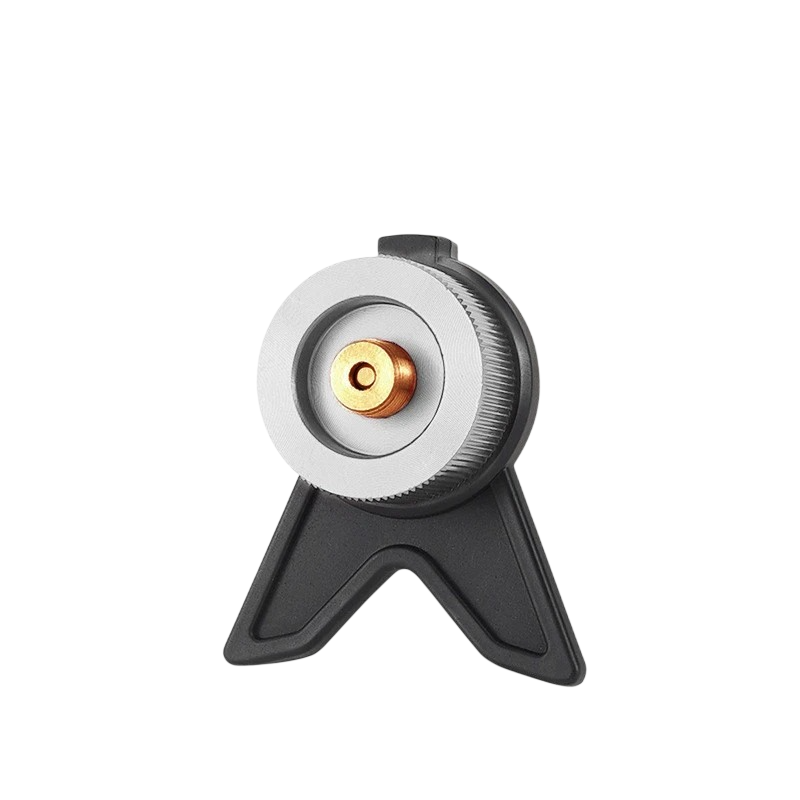 Adattatore in alluminio compatto con valvola a vite per un collegamento sicuro del fornello, ideale per campeggio, escursionismo e cucina all'aperto. Descrizione completa