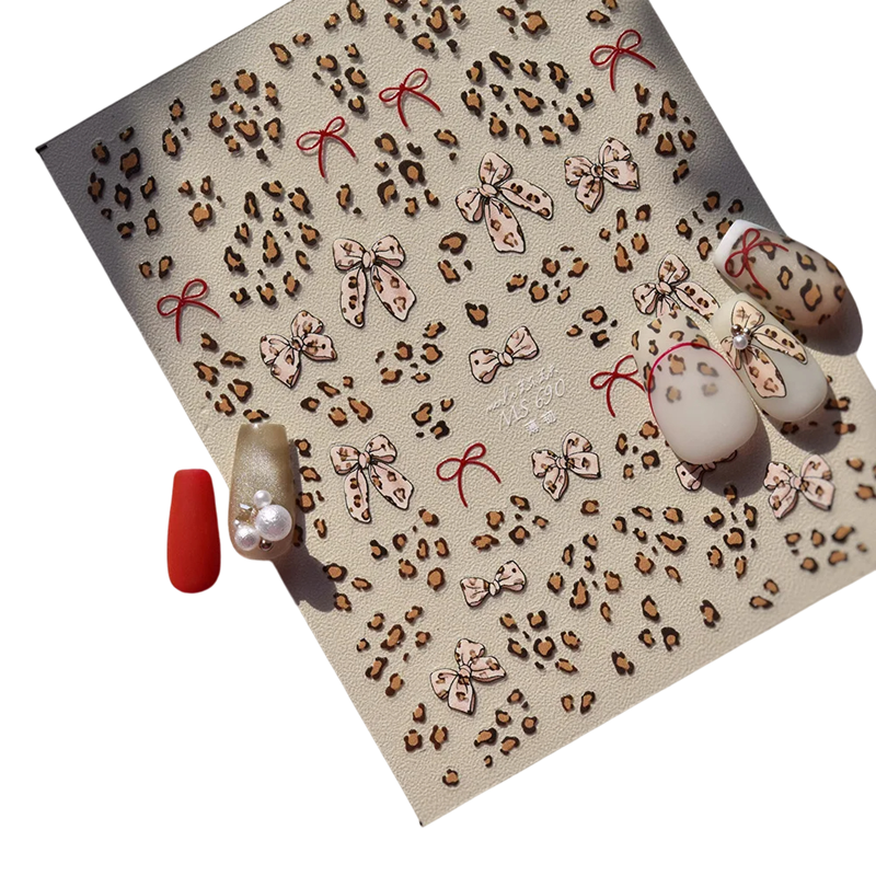 Adesivi 3D leopardati con fiocchi per un nail art stiloso. Facile applicazione, lunga durata e design accattivante adatto per occasioni quotidiane e speciali. Descrizione completa
