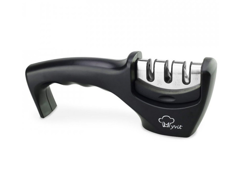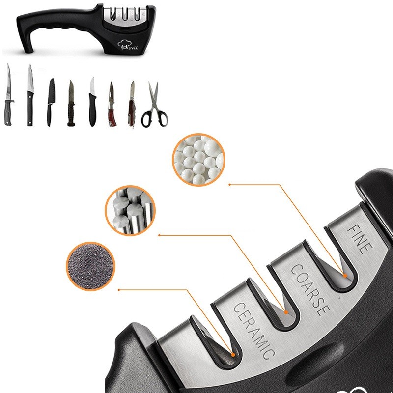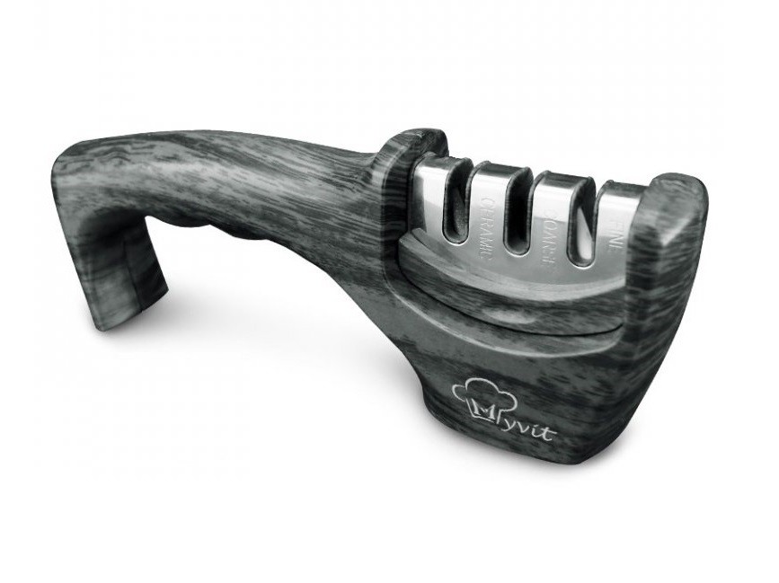 Ha tre inserti abrasivi - in ceramica (preparazione per l'affilatura), acciaio tungsteno e diamante (affilatura fine finale).