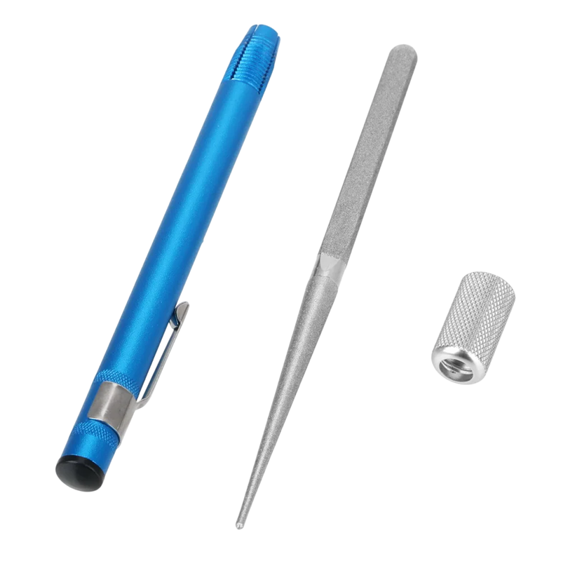 Affilatore diamantato compatto in acciaio al carbonio a forma di penna, ideale per affilare rapidamente ami da pesca e coltelli da cucina in viaggio. Descrizione completa