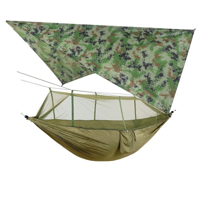 Questa amaca è perfetta per chi ama dormire all'aperto. L'amaca con telo contro la pioggia si installa facilmente ed è realizzata in nylon di alta qualità e resistente. Ha una capacità fino a 300 kg. Include una rete contro gli insetti e un telo contro la pioggia o il sole. Quindi puoi essere sicuro che ti riposerai sempre alla grande.
