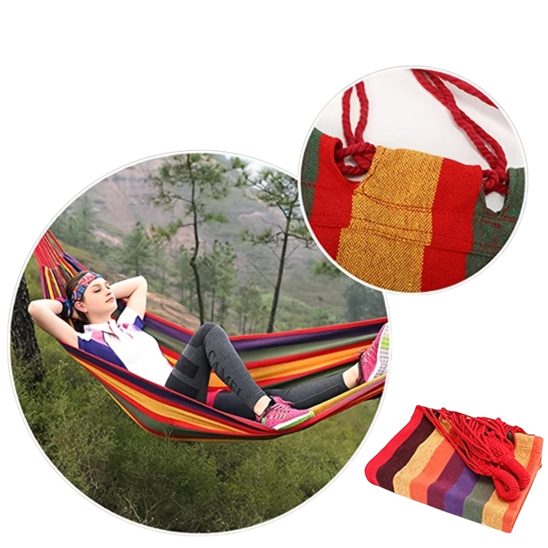 Amaca da sospensione resistente e confortevole in tela robusta, ideale per dormire e rilassarsi all'aperto, facilmente trasportabile grazie alla confezione compatta 30x15x6 cm. Descrizione completa