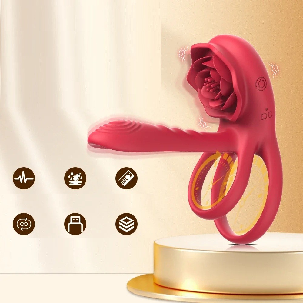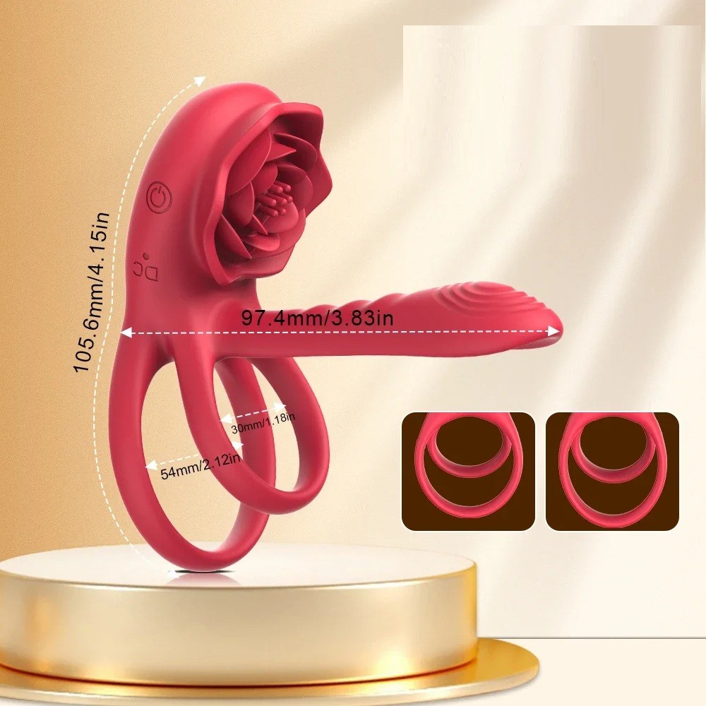 Questo lussuoso anello di contenimento vibrante è progettato per il divertimento di coppia e offre un effetto stimolante triplo. I doppi anelli di silicone avvolgono saldamente la base del pene e i testicoli, supportando l'erezione e prolungando la durata. Nella parte superiore è posizionata una grande parte stimolante piatta a forma di rosa in fiore, che stimola il clitoride durante il contatto – inoltre nasconde un'apertura di suzione che funziona come un womanizer. Nella parte anteriore si estende lungo il corpo una barra vibrante con superficie scanalata per una stimolazione aggiuntiva del partner ad ogni movimento.