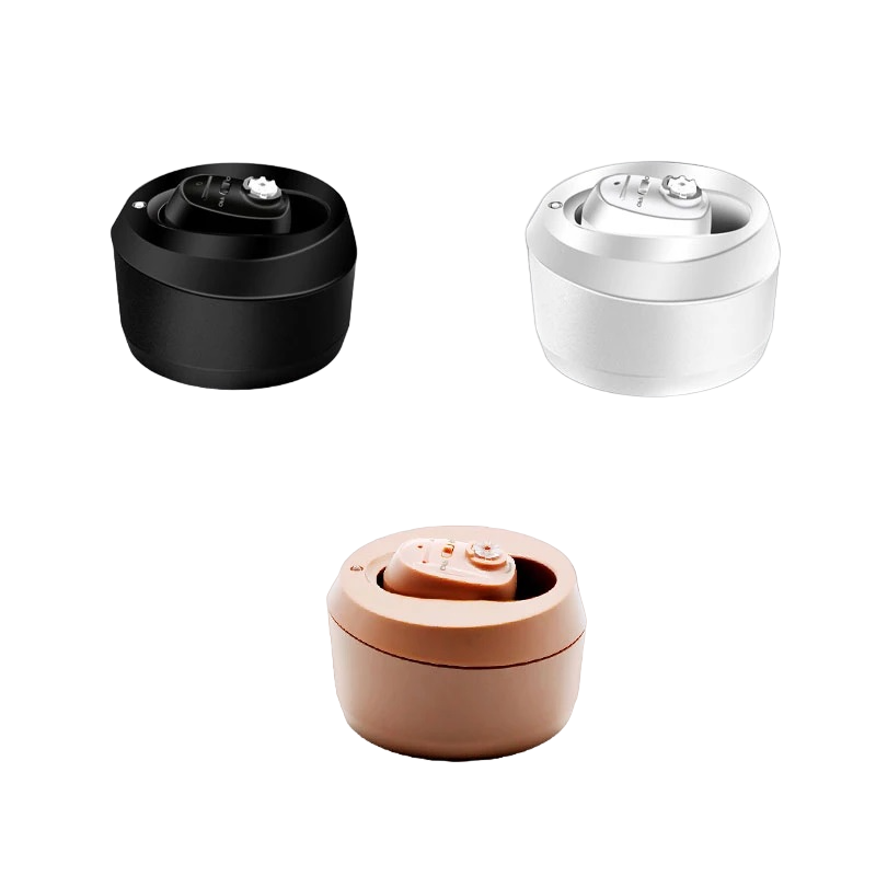 • Contenuto della confezione: 1 x apparecchio acustico, 4x tappi in silicone, 1x custodia, 1x cavo di alimentazione, 2x spazzole per la pulizia
