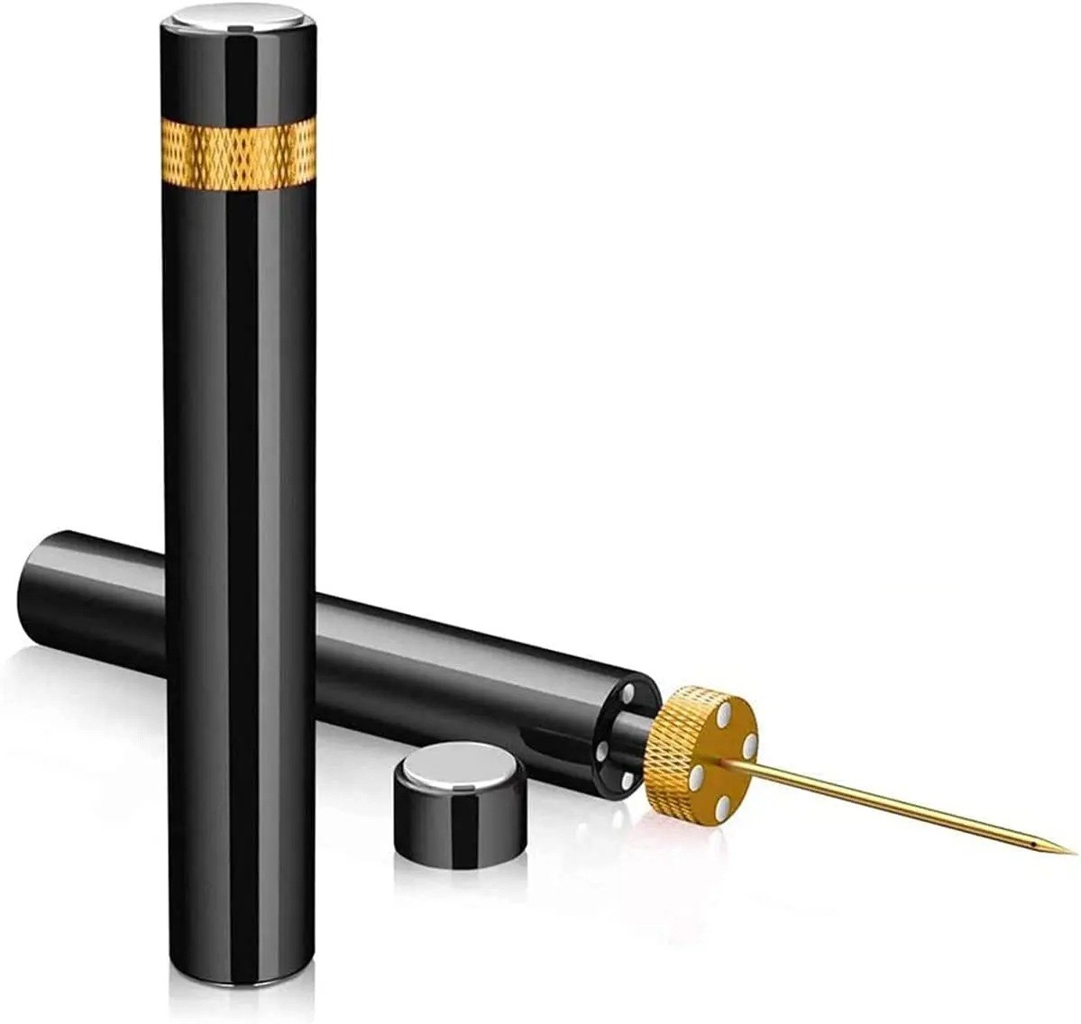 Il moderno apribottiglie a pressione per vino con pompa rappresenta un modo innovativo per aprire le bottiglie senza la tradizionale avvitatura. Funziona secondo il principio della pressione dell'aria – un sottile ago metallico viene inserito attraverso il sughero e con alcune pressioni si crea un vuoto che espelle facilmente il sughero. L'apribottiglie è progettato per non danneggiare il sughero né il collo della bottiglia. Grazie al suo elegante design in colore nero, è ideale non solo per la casa, ma anche come regalo. Le dimensioni compatte consentono un facile trasporto – anche in borsa o zaino.