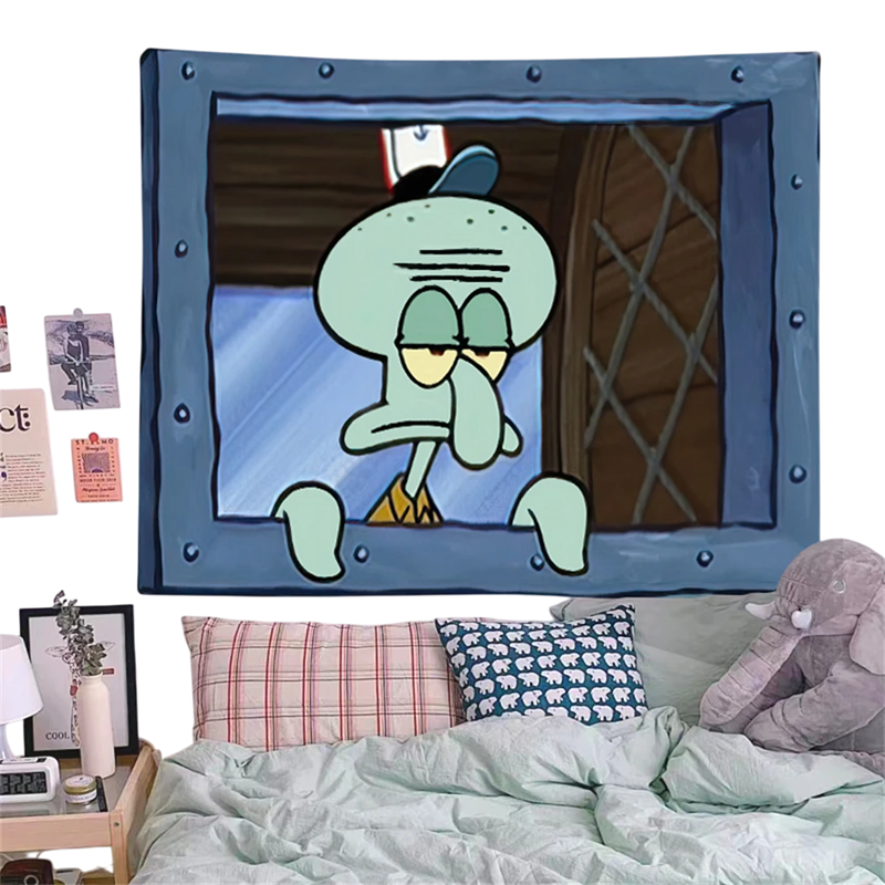 Grande arazzo da disegno con il motivo del Polpo di SpongeBob per gli amanti delle animazioni. Gobelino estetico da parete per la stanza, facile da pulire e appendere. Descrizione completa