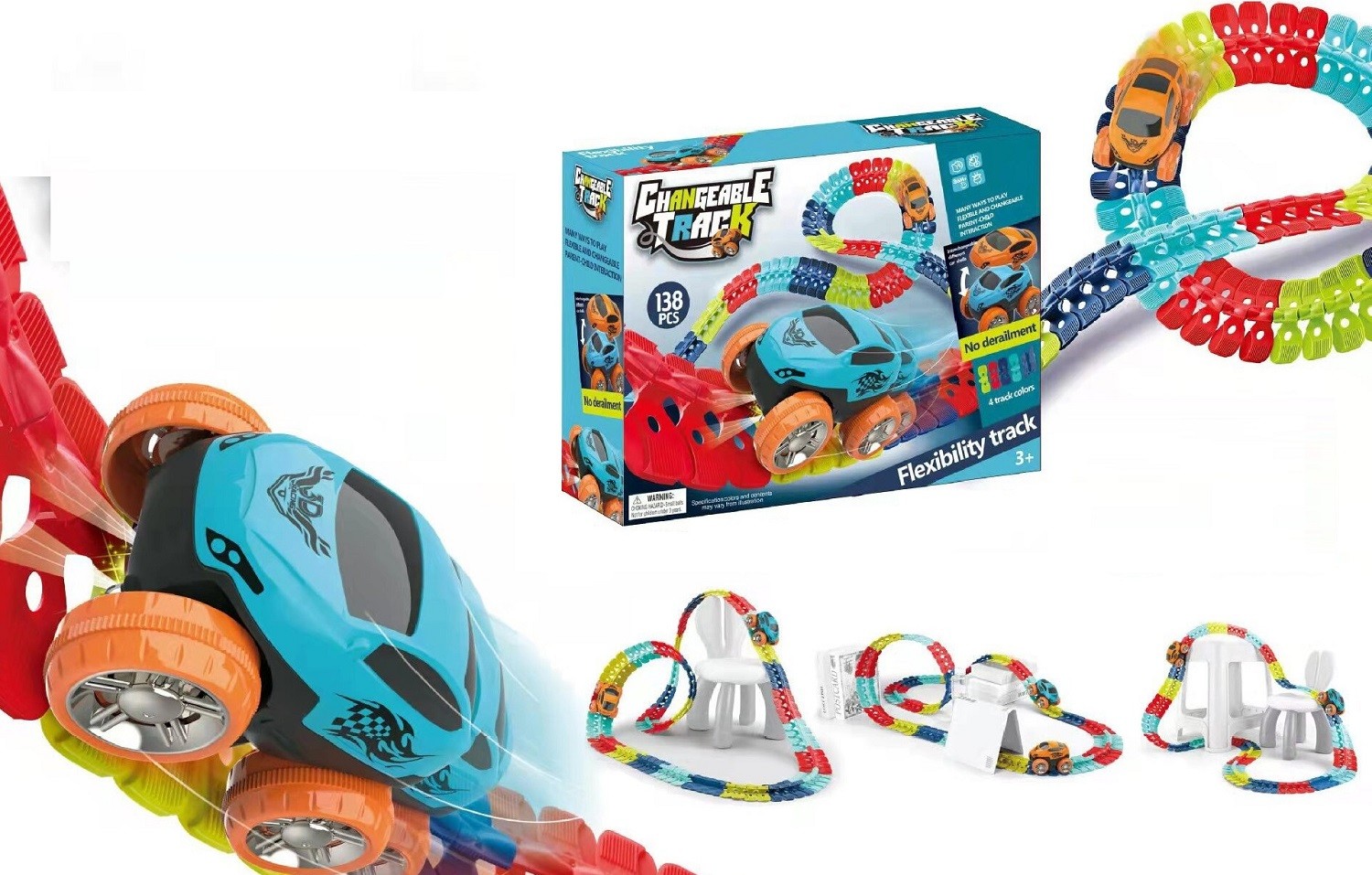 138 pezzi di costruzione per la pista da corsa. Auto luminosa. Ottimo divertimento per i bambini. Le auto corrono da sole sulla pista. Alimentazione 2x batterie AA. Descrizione completa