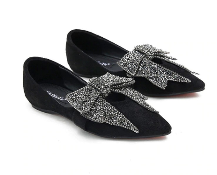 Queste eleganti ballerine con fiocco sembrano perfette. Il fiocco è realizzato con pietre brillanti.