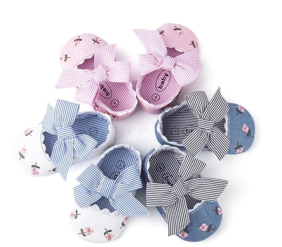 Le ballerine da ragazza con nastro sono decorate con piccoli fiori.