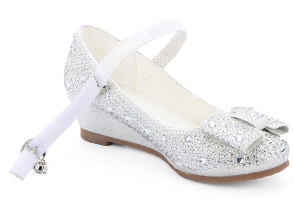 Le ballerine sono decorate con pietre e hanno un cinturino sul collo del piede con chiusura in velcro.
