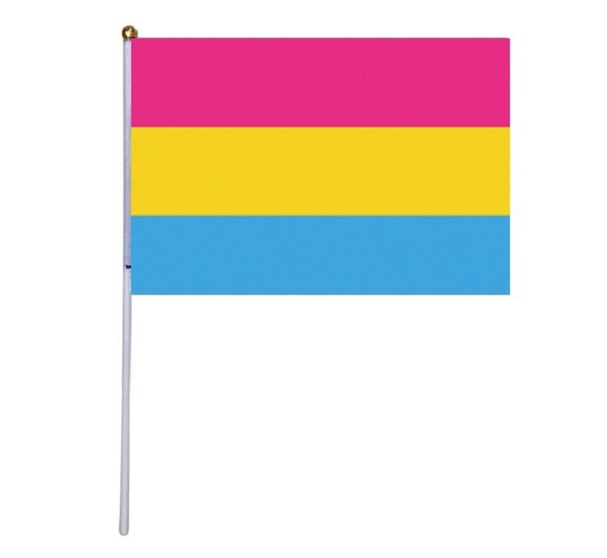 Bandierina pansexuale di orgoglio con asta in plastica. Ha dimensioni di 14 x 21 cm. Realizzata in materiale di alta qualità. Garantita lunga durata e stabilità dei colori. Adatta per decorare interni, ma anche per sfilate.