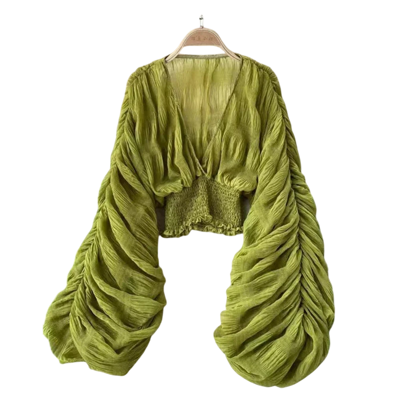 Leggera blusa da donna con scollatura profonda, maniche arricciate e vita elastica, ideale per le giornate estive, feste e tempo libero. Descrizione completa