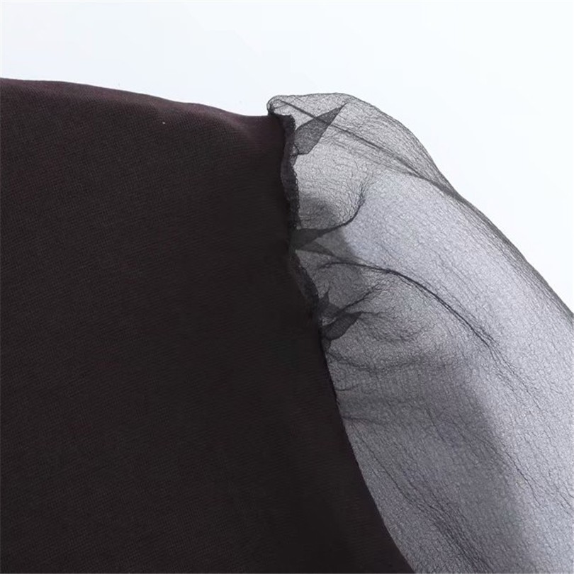 Decorata con lunghe maniche vaporose in tessuto trasparente.