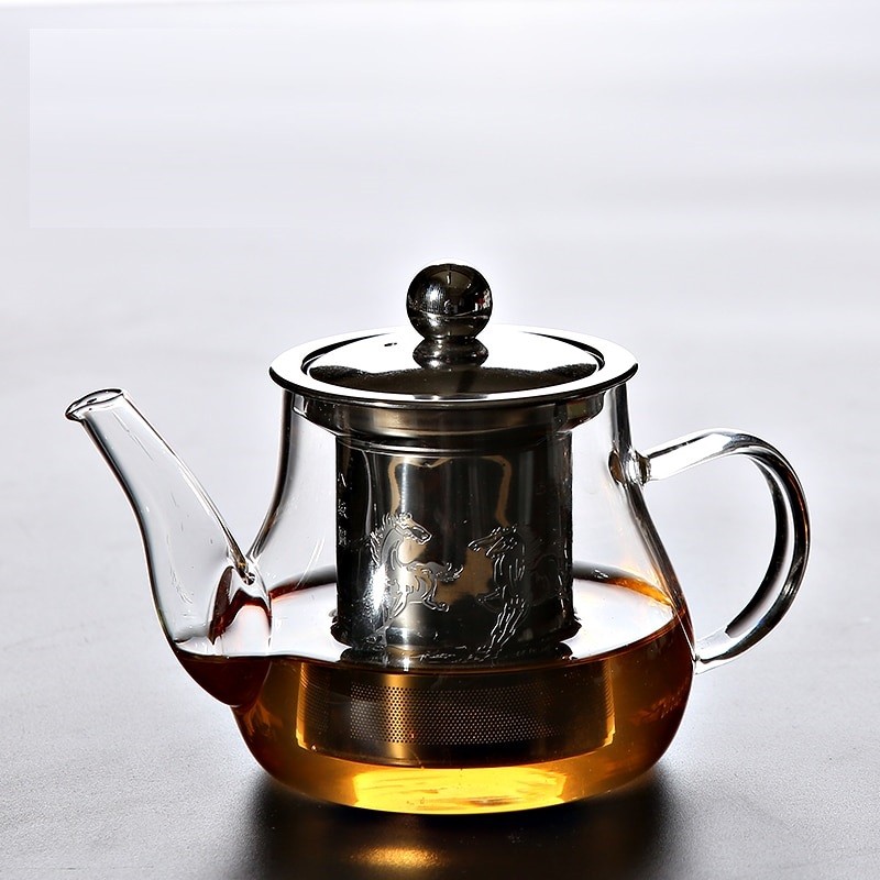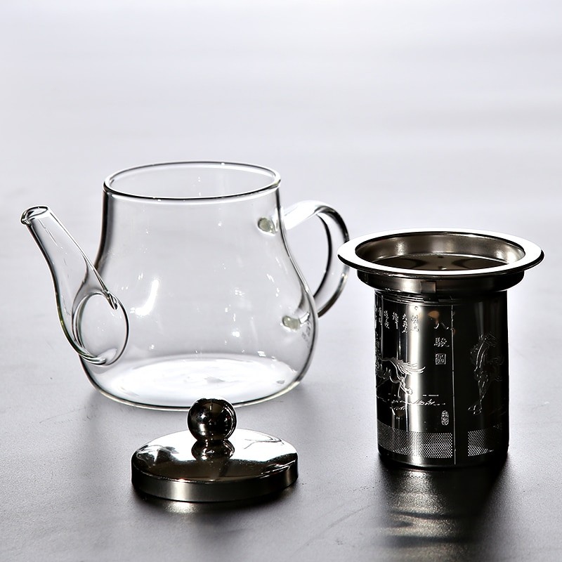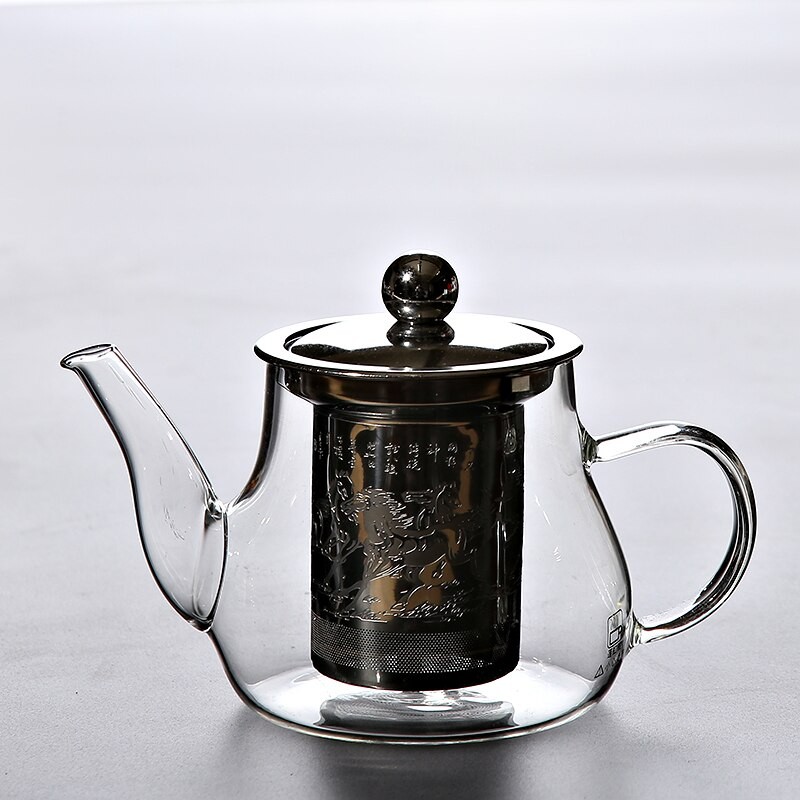 Bollitore con filtro in acciaio inossidabile decorato con un tradizionale motivo cinese.