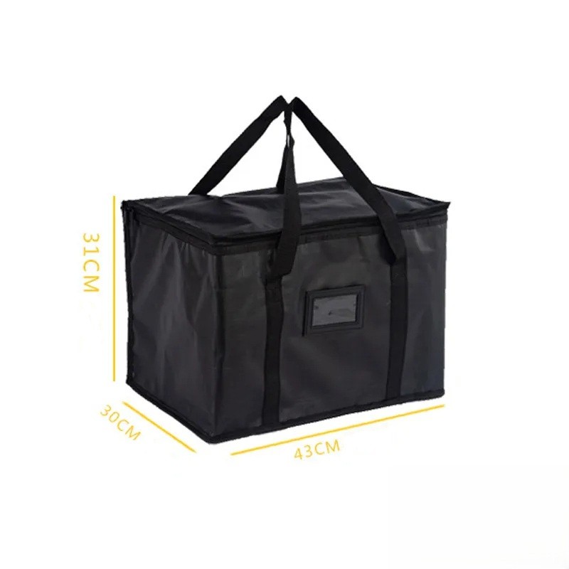 Borsa termica nera di grande capacità con strato isolante, manici robusti e zip, mantiene gli alimenti freschi, ideale per acquisti, picnic e trasporto di cibo. Descrizione completa