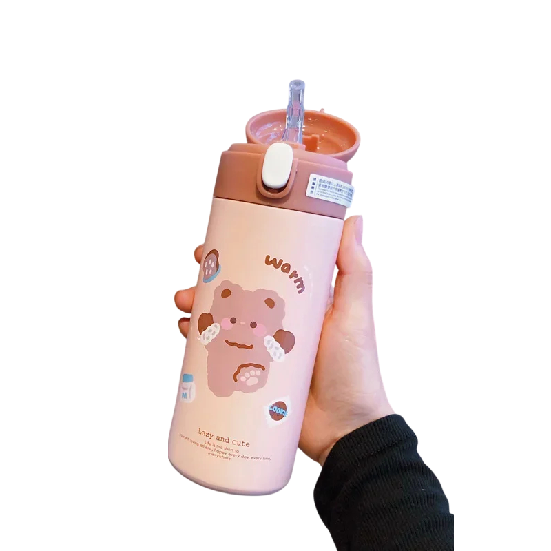 Bottiglia termica in acciaio inox con cannuccia e tappo a pulsante 380 ml bottiglia a vuoto 18 x 6,5 cm rosa chiaro con motivo animali per viaggi e scuola
