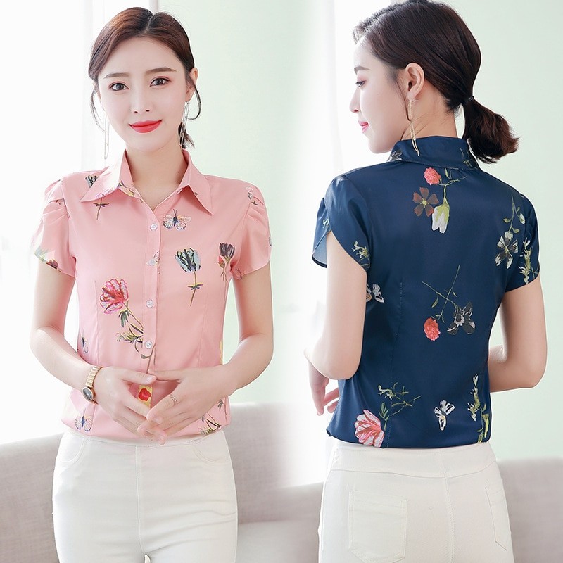 Camicia da donna con maniche corte e colletto classico.