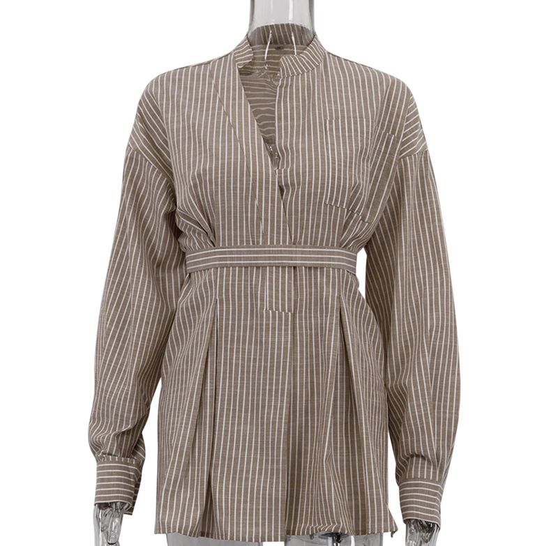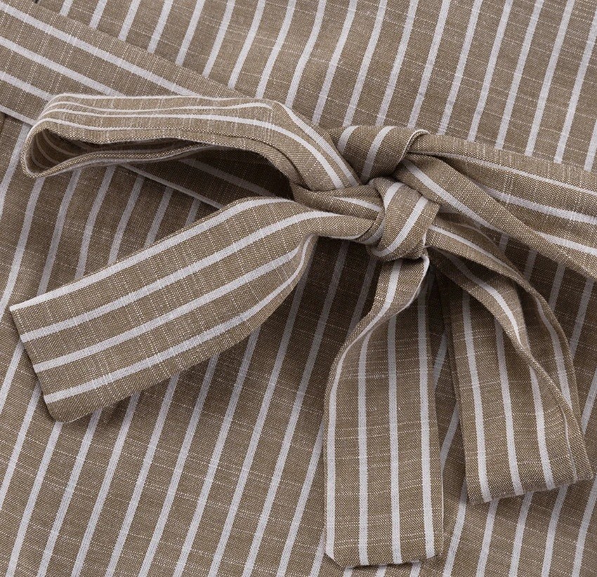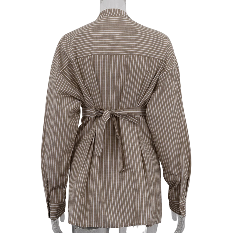 Pagina iniziale Pagina iniziale Abbigliamento e accessori Abbigliamento donna Camicie da donna Camicie a righe da donna Camicia da donna marrone a righe con colletto e maniche lunghe Blusa elegante con fiocco sulla schiena in vita Miscela di poliestere e cotone