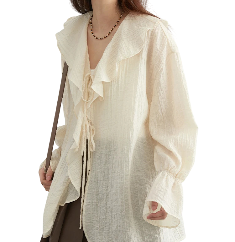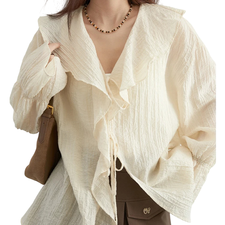 Camicia elegante da donna con volant e colletto Camicetta monocolore con maniche lunghe Chiusura con lacci Top alla moda in nylon e lyocell