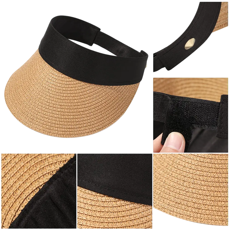 Cappello a visiera pieghevole in paglia per donne 56–58 cm Cappello estivo arrotolabile con protezione UV Visiera larga Parte superiore vuota Da viaggio Traspirante