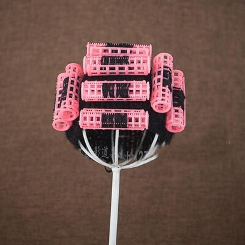Vitpna cappello lavorato a maglia con bigodini rosa.