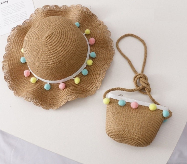 Bellissimo set estivo per ragazze - cappello di paglia con pompon e borsa nello stesso design.