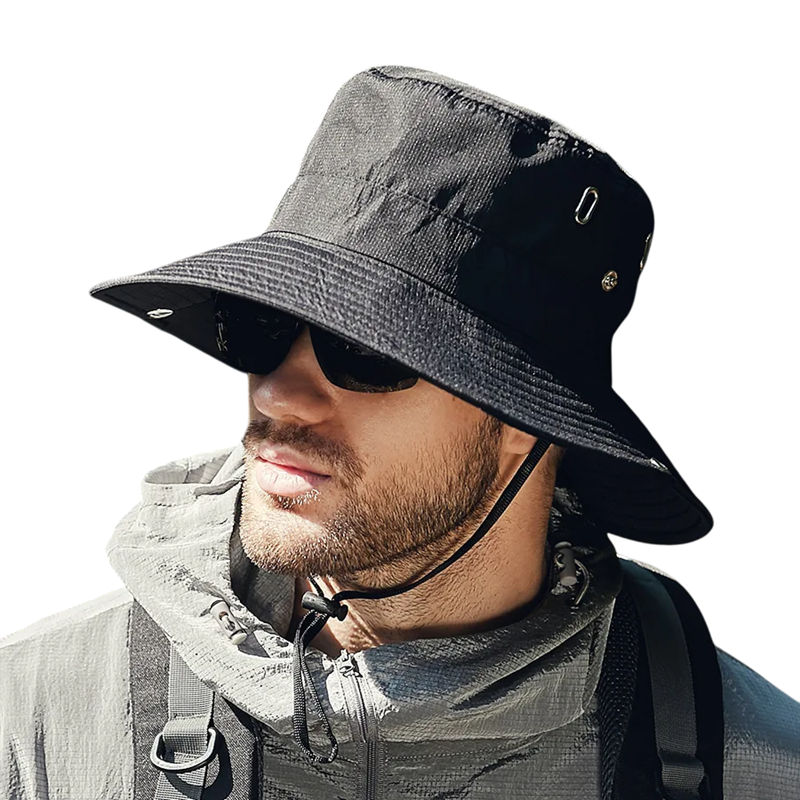 Cappello estivo leggero da uomo con ampia visiera e corda regolabile, ideale per escursioni, giardinaggio, pesca e viaggi. Descrizione completa