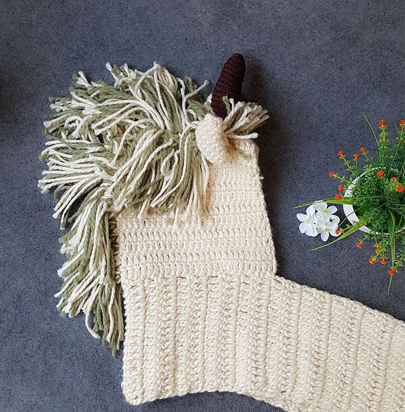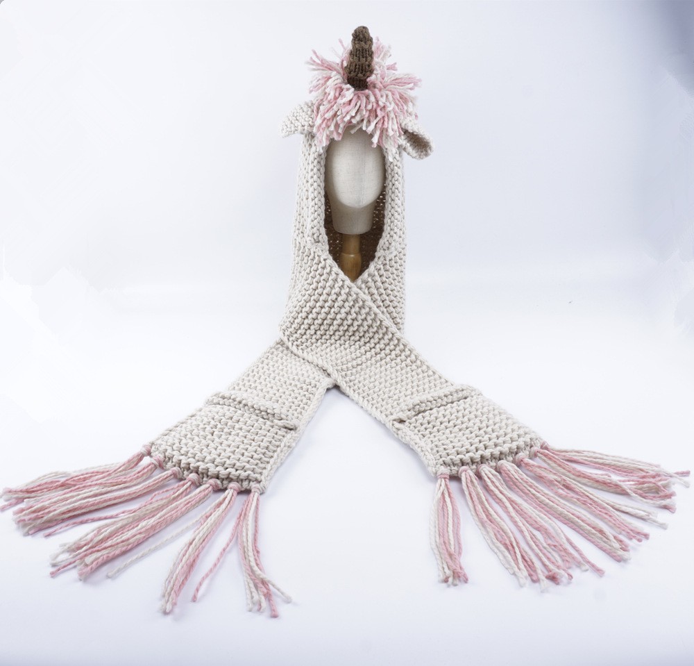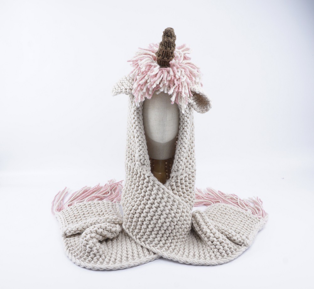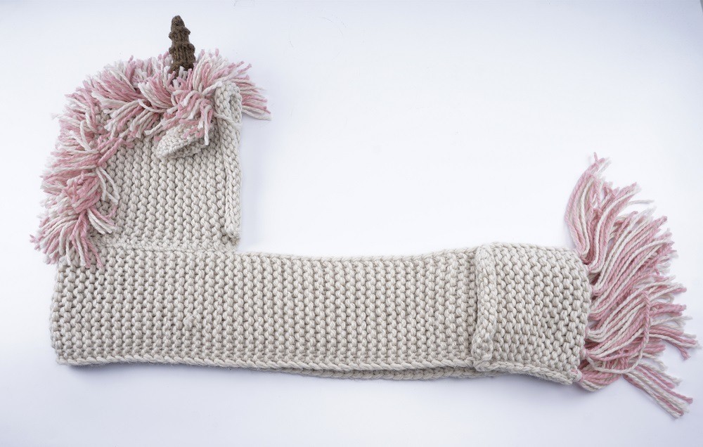 La sciarpa è in stile unicorno, ha un corno, una criniera e orecchie.