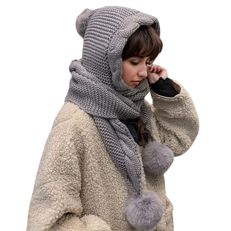 • Cappuccio invernale da donna con sciarpa integrata come set pratico in un unico pezzo