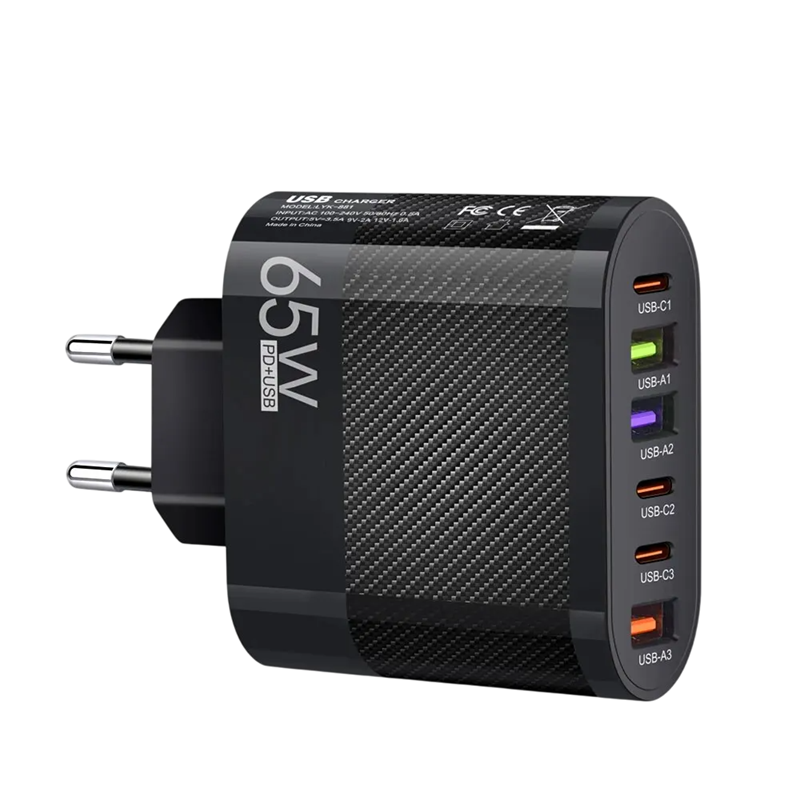 Questo potente caricabatterie rapido 65W 6in1 è la scelta ideale per chi ha bisogno di ricaricare più dispositivi contemporaneamente. Offre fino a 6 porte di uscita – 3x USB-C e 3x USB-A, consentendo di alimentare telefoni, tablet, cuffie, power bank e altra elettronica simultaneamente. Grazie al supporto delle tecnologie Power Delivery (PD) e Quick Charge 3.0 (QC3.0), fornisce una ricarica rapida, stabile e sicura per un'ampia gamma di dispositivi. Il caricabatterie è compatibile con una tensione di ingresso 100–240V, quindi è adatto anche per viaggi all'estero. Il corpo compatto con spina EU solida facilita l'uso quotidiano a casa, in ufficio o in viaggio.