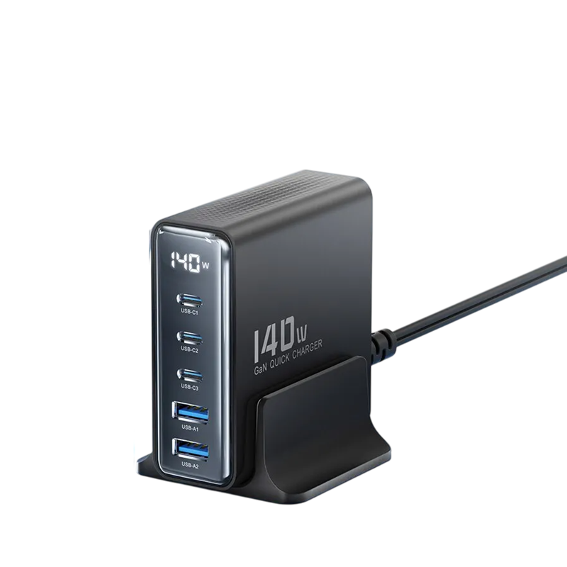 • Potenza 140 W e 5 porte (2× USB A, 3× USB C) – carica più dispositivi contemporaneamente