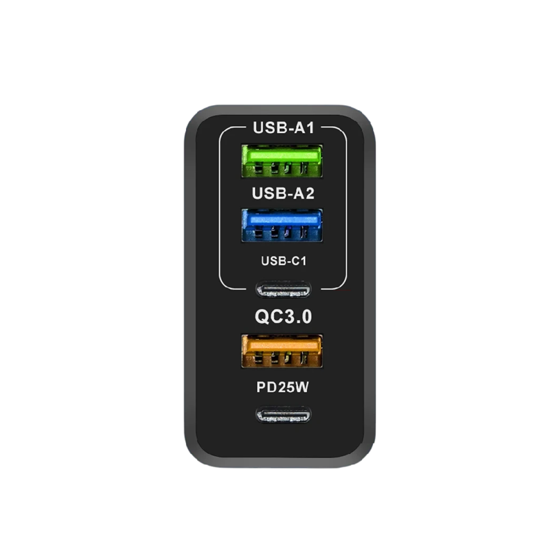 Questo caricatore rapido compatto da 65W è la scelta ideale per chi desidera ricaricare rapidamente e in modo efficiente più dispositivi contemporaneamente. Grazie ai cinque porti di uscita (3× USB A e 2× USB C) è possibile ricaricare fino a cinque dispositivi contemporaneamente, sia a casa che in viaggio. L'adattatore supporta la tecnologia Power Delivery (PD) e fornisce una corrente di uscita fino a 3,1 A, il che significa alta velocità di ricarica per i dispositivi compatibili. È realizzato in materiale PC di alta qualità resistente alle alte temperature, dotato di protezione contro il surriscaldamento e cortocircuito e ha una tensione di ingresso universale di 100–240V. Questa testa di ricarica è compatibile con la maggior parte dei dispositivi – dai telefoni cellulari ai tablet, smartwatch o power bank.