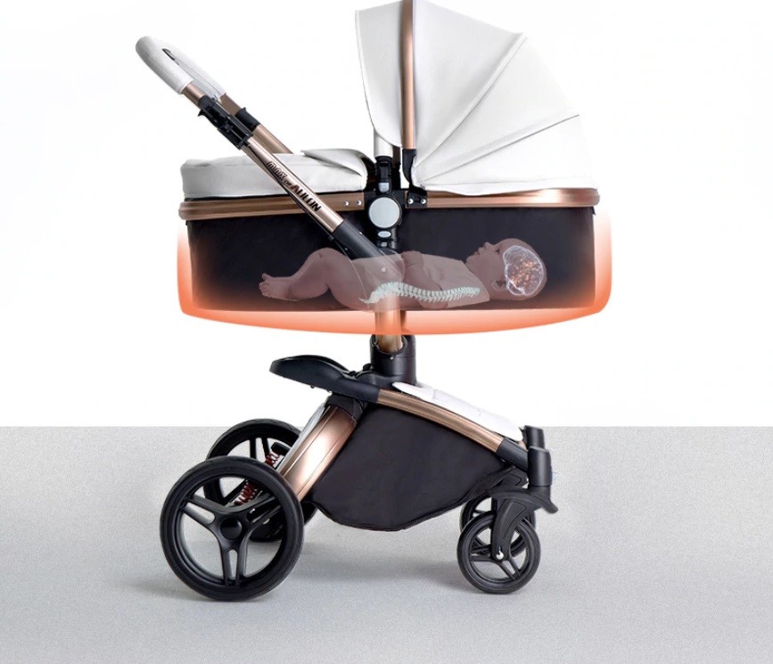 Carrozzina inclusa di materasso, zanzariera, coprigambe e seggiolino auto.