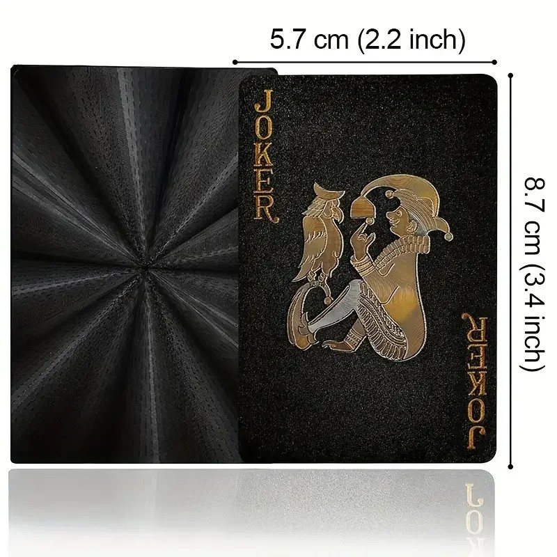 Questo set di carte da gioco in plastica nere è progettato per chi cerca uno stile eccezionale, un aspetto elegante e alta resistenza. La superficie di ogni carta è realizzata in un elegante colore nero opaco con decorazioni metalliche lucide e un rilievo dettagliato, che appare estremamente lussuoso. Il set include 55 carte di dimensioni 57 x 87 mm, adatte per poker, scopone, canasta e altri giochi di carte.